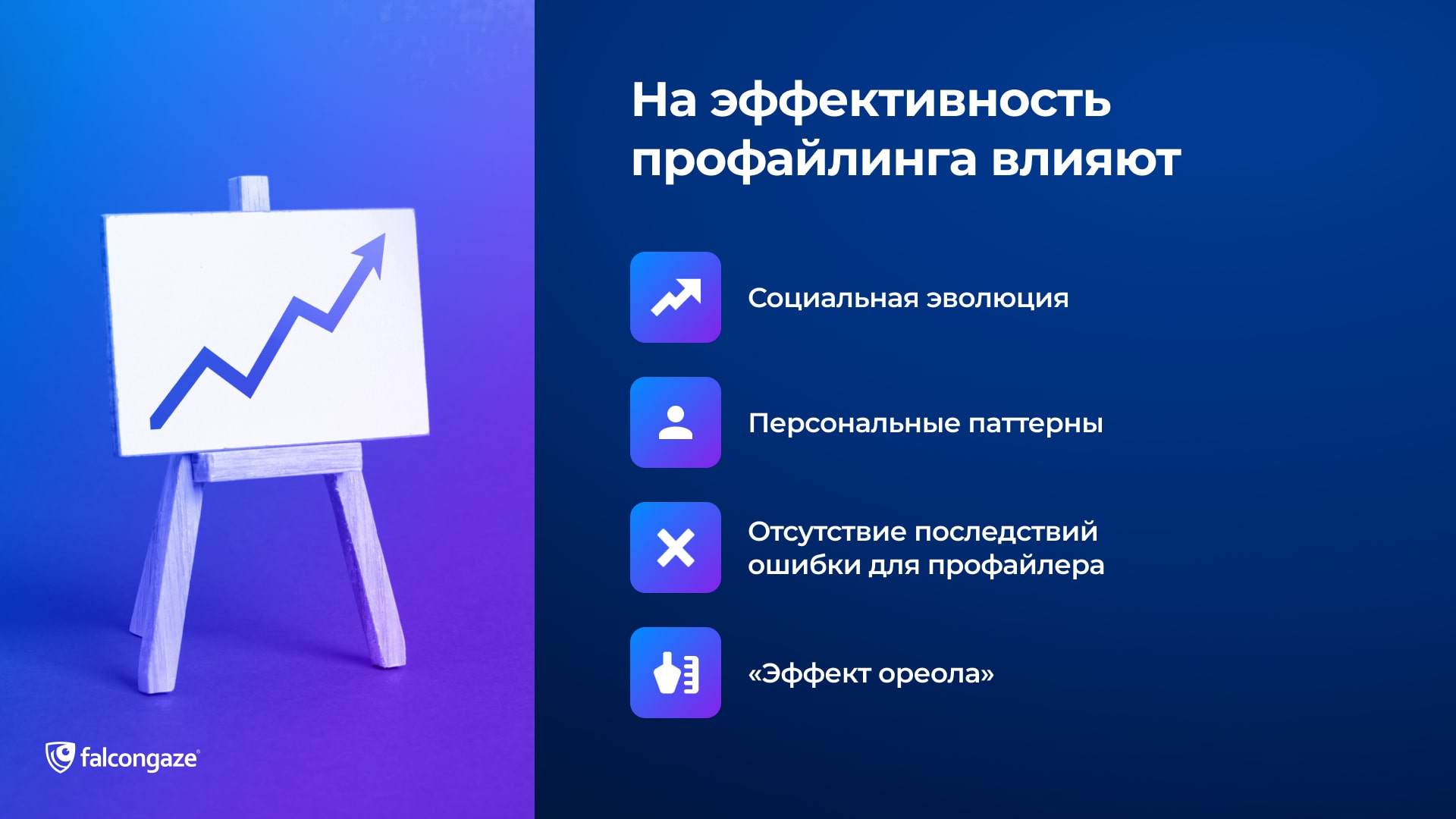 - Персональные паттерны. Профайлер может переносить свой опыт на исследуемого человека и делать выводы с ошибочной поправкой на собственное восприятие.