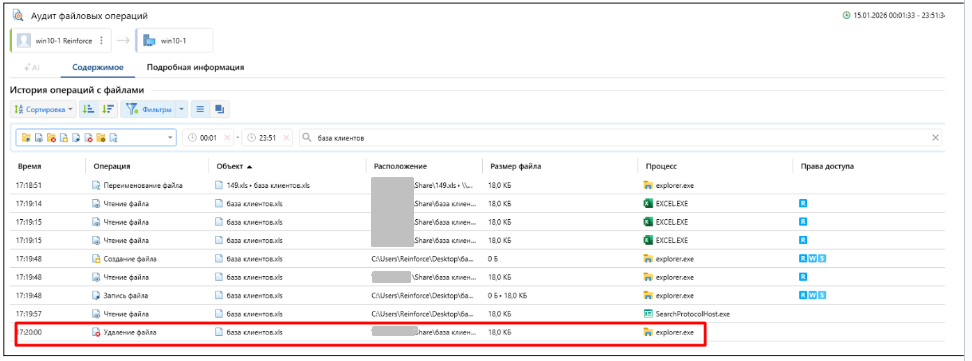 Видим результат — выявлен факт удаления конфиденциального документа.
