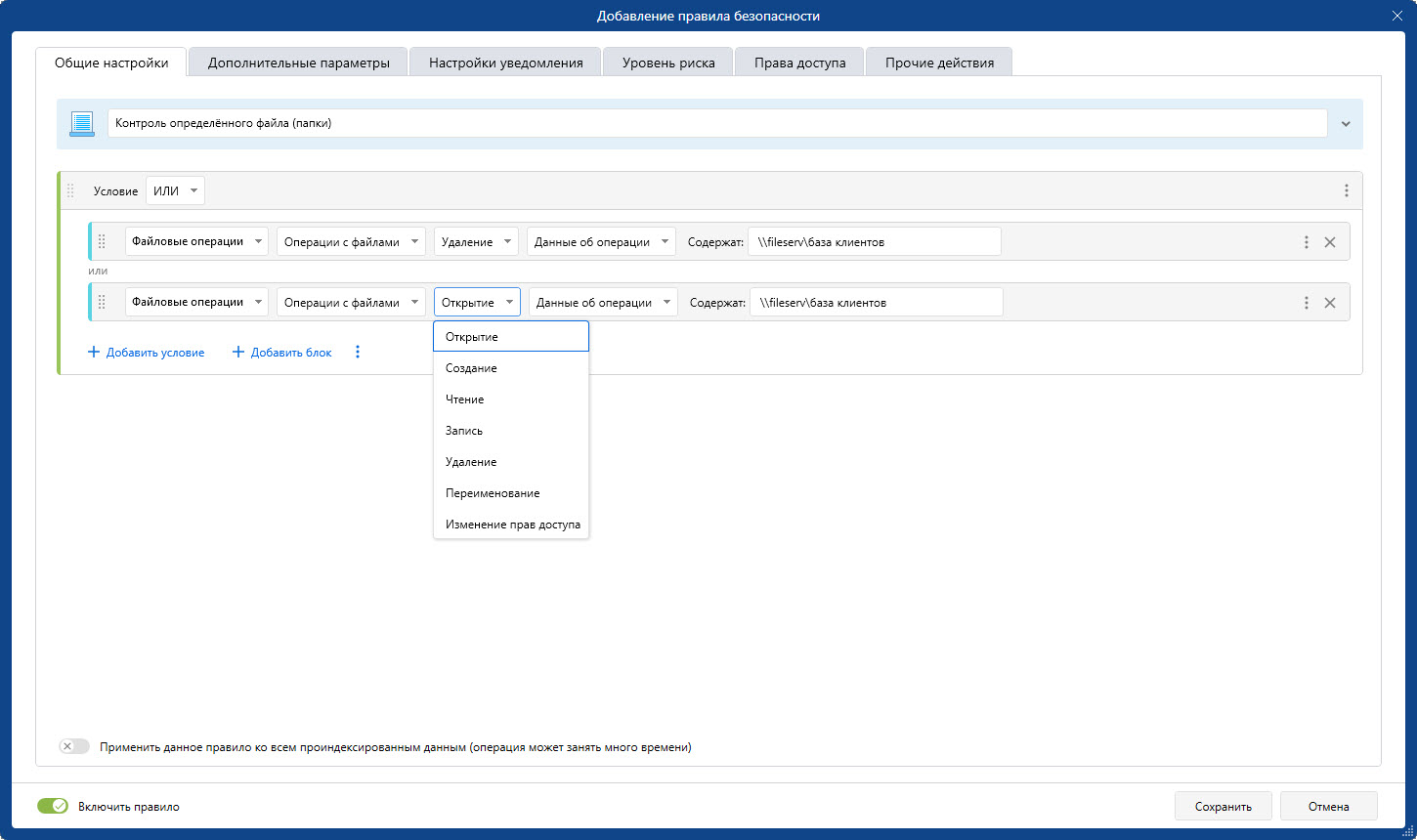 Для этого в SecureTower создаем политику безопасности. Прописываем путь к папке, указываем интересующие операции.