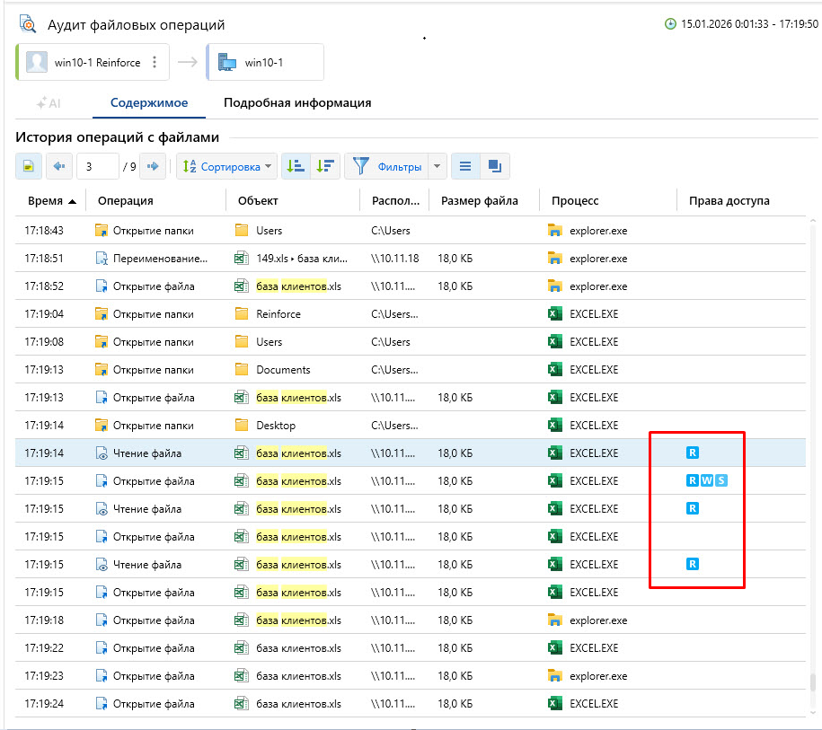 Более того, если мы выявили операцию с документом, есть возможность узнать какими правами доступа обладает сотрудник относительно данного файла. На что указывают соответствующие метки: