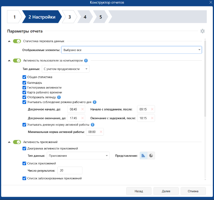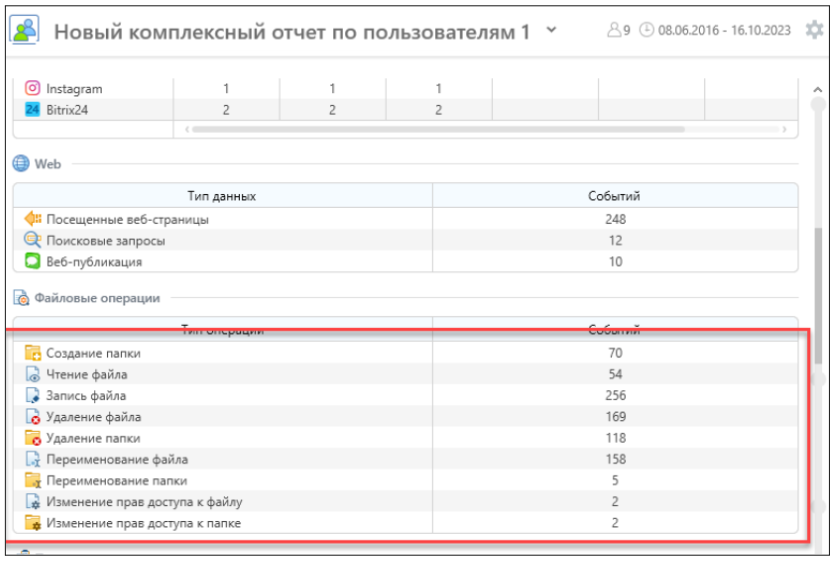 Через «Конструктор отчетов» можно сформировать дополнительный отчет по сотруднику для просмотра информации по всем операциям с файлами и папками за выбранный период.
