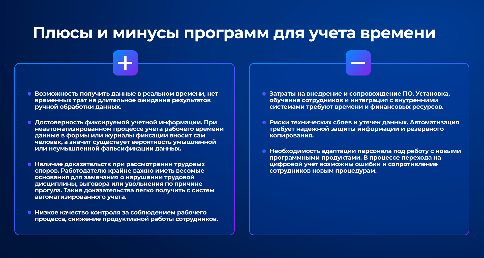 Недостатки: необходимость соблюдения законодательства о персональных данных (ФЗ-152), затраты на внедрение и обслуживание.