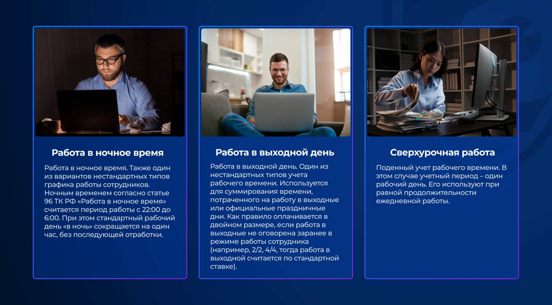 | Работа в ночное время | Период с 22:00 до 6:00 согласно статье 96 ТК РФ. Рабочий день в ночное время сокращается на один час без последующей отработки. |
